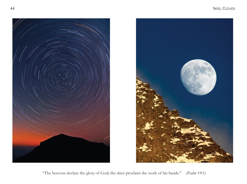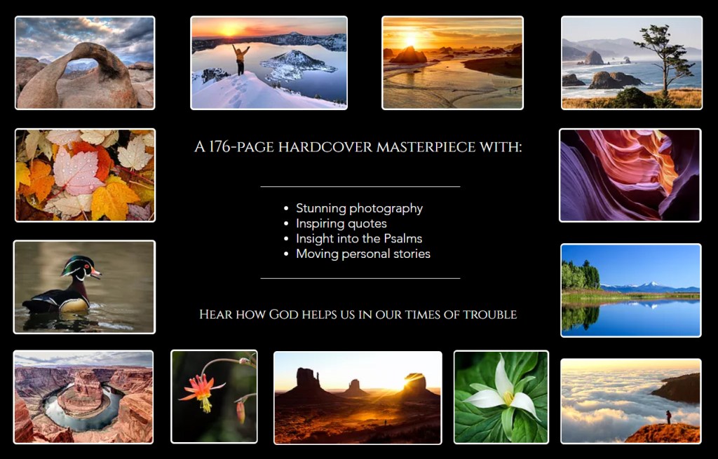 But don’t think that this book is only a book of photography to peruse for enjoyment (though it is that!). Each chapter has a personal story of how God was faithful to Steve and his family in times of difficulty – difficulties we all face in life. And the devotional readings on the Psalms are insightful, challenging, and spiritually nourishing. But how might you use this book? I will offer a couple suggestions in a moment. But first, here’s an example of what a whole page looks like: